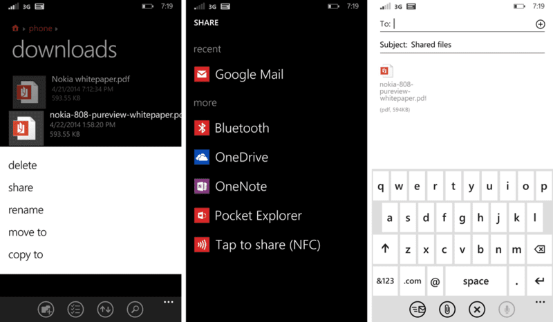 The most awesome thing about the File Manager App (Files) is its sharing capabilities? You can share anything any time with all the possible options given. Just Press and hold the specific file and click the share button. You would see all the possible options your phone provides to send the specific file. It could email, Bluetooth, NFC or OneDrive.