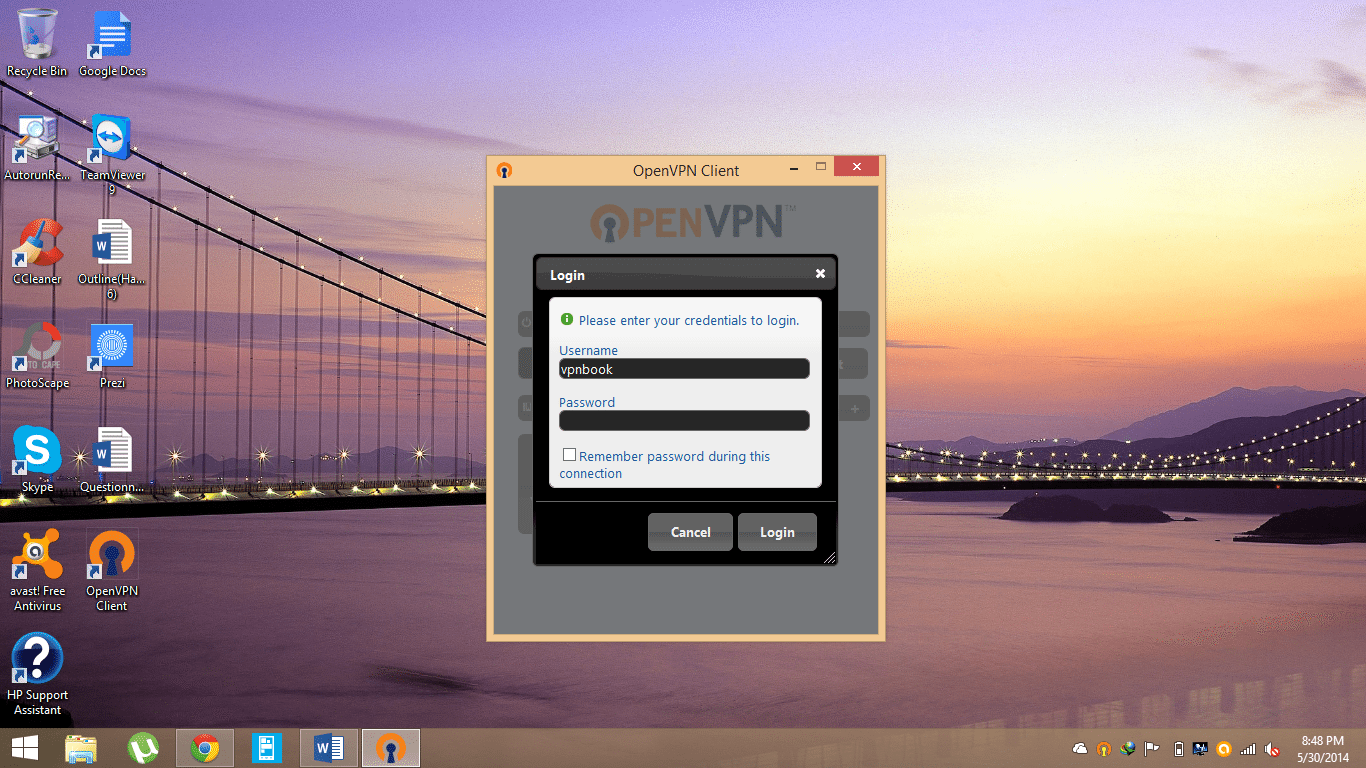 - When prompted for Username and Password, write ‘vpnbook’ in the first section.