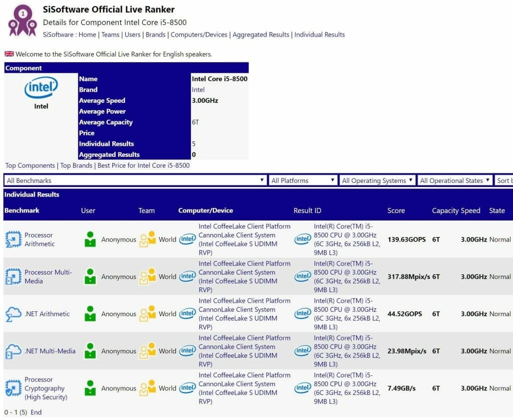 SANDRA database doesn’t reveal Turbo Boost clocks of 8500 but, as we know Core i5 8400 has 4.0GHz Turbo boost so, 8500 might get 4.3 Ghz of Turbo Boost or somewhere near it. Intel Core i5 has 6 cores and 6 threads with 9 MB of shared L3 cache and a TDP rating of 65W.