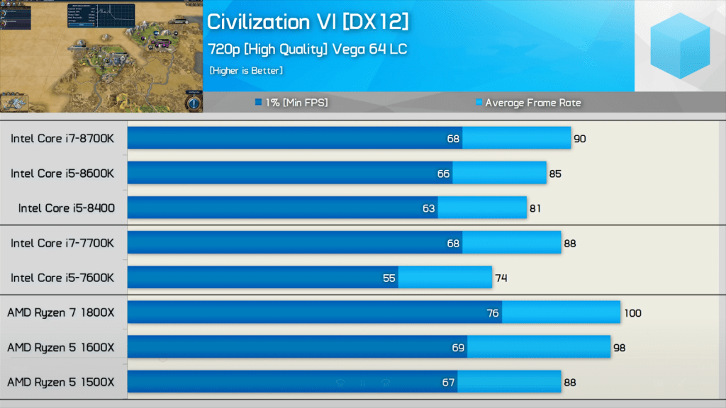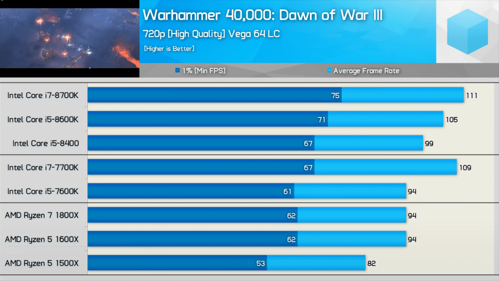 The two main processors we are comparing here show significant performance difference. Intel Core i7 8700K has 41fps more than AMD Ryzen 1800X, which pretty much proves 8700K is better.