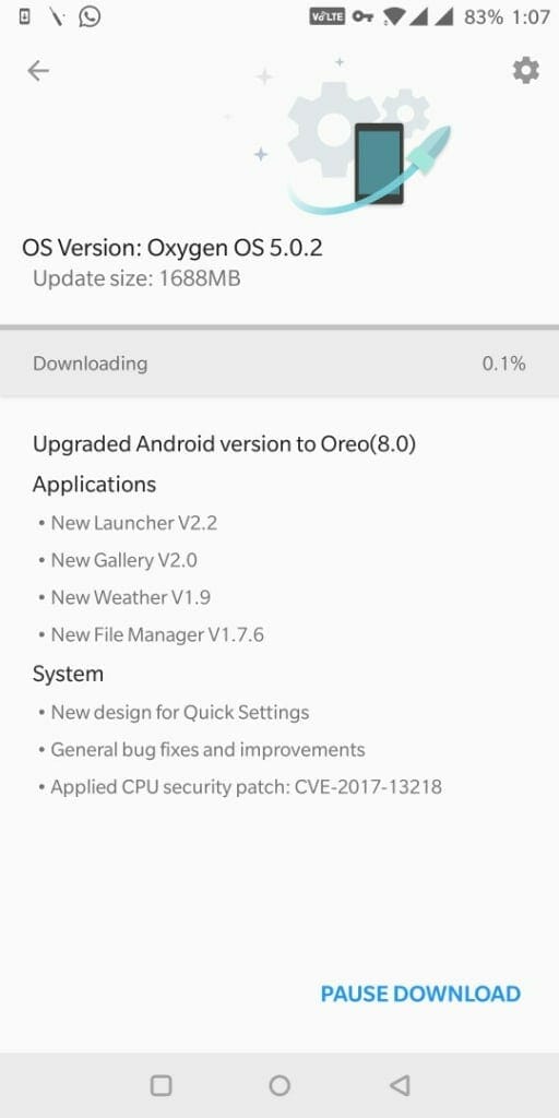 - Download the latest official OxygenOS Android Oreo OTA update from these links. OOS 5.0.2 Full Zip: Android Oreo OP 5T (Note: This is not incremental OTA, it is full OS file and will take some time to install if you get stuck you can Wipe Dalvik & Cache)