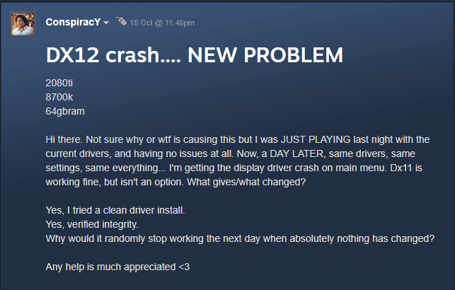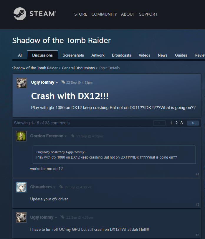 There are many threads on multiple websites where people are addressing Shadow of the Tomb Raider crash when the game is played on DirectX 12 on Nvidia RTX graphics cards. Here are some of the screenshots of the thread addressing the same problem: